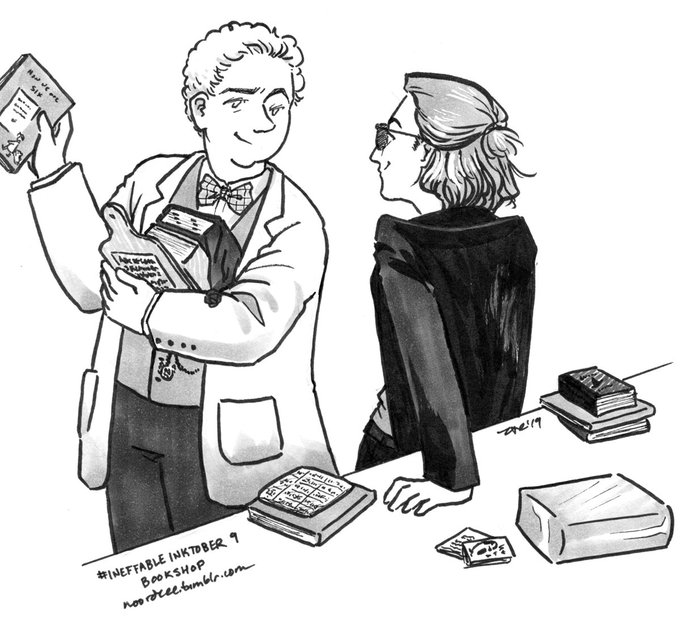 "[Aziraphale] had never done other to get rid of demons than to hint to them very strongly that he, Aziraphale, had some work to be getting on with, and wasn’t it getting late? And Crowley had always got the hint." #IneffableInktober 9 - Bookshop! #GoodOmens #Inktober2019