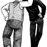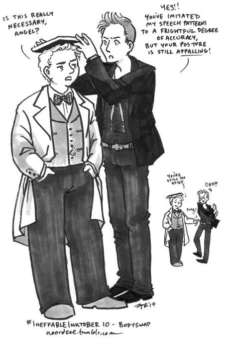 Practicing each other’s mannerisms for #IneffableInktober 10, Bodyswap. Personally, I can balance stuff on my head and walk around while slumping, though, that isn’t a very good test of posture, Aziraphale! #GoodOmens #inktober2019