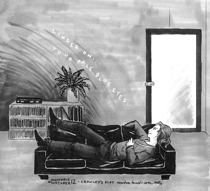 Just a demon relaxing at home, listening to Pale Blue Eyes. For #IneffableInktober 12, Crowley’s Flat. yep just relaxing. not pining. very demonic. very slothful. #GoodOmens #Inktober2019