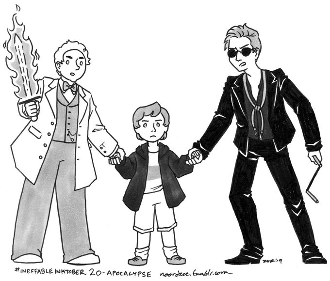 #IneffableInktober 20, Apocalypse, featuring Adam, an antichrist, and his two surprise godfathers. Went for a flat, simple style entirely because I suddenly found it hard to draw Aziraphale’s hair the usual way… #inktober2019 #goodomens