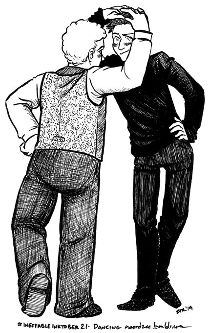 The Gavotte for #IneffableInktober 21, Dancing. I found a picture of a step where the partners form a “mirror” with their arms to look at each other through and I was like Y E S (boys that’s not an approved dance step, what’re you – well alright then) #goodomens #inktober2019