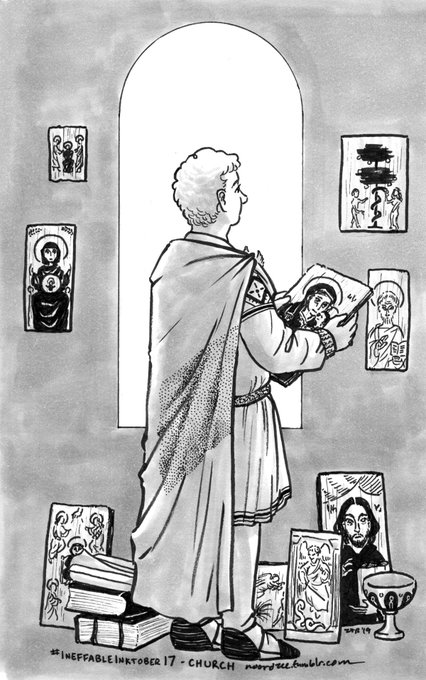 For #IneffableInktober 17, Church. I have a feeling Aziraphale didn’t enjoy Byzantine Iconoclasm very much, given how much he likes to keep hold of works of art and literature. Maybe he squirreled away some favorite pieces in the 700s. #goodomens #inktober2019