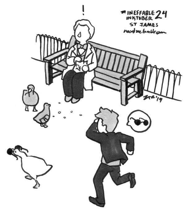It’s a beautiful day in St. James Park, and this joke has been done already but it was all I wanted to draw as soon as I saw the #IneffableInktober 24 prompt. Go play #UntitledGooseGame. #goodomens #inktober2019