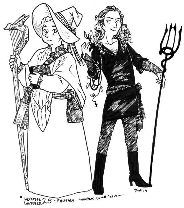 Found time to do a #dungeonsanddragons AU for #IneffableInktober 25, Fantasy. Aziraphale’s PC started out as a cleric, but he kept distracted by wizard stuff so DM Adam let him multiclass. Crowley’s warlock soon followed suit, taking on druid powers. #goodomens #inktober2019