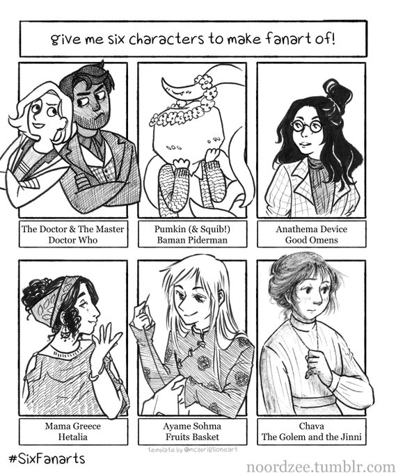 Did the #sixfanarts meme over on tumblr! All were drawn in a mixture of micron pen and pentel brush. The lovely earthy texture I achieved for Chava was from an empty pentel ink cartridge. #DoctorWho #bamanpiderman #goodomens #hetalia #fruitsbasket #thegolemandthejinni