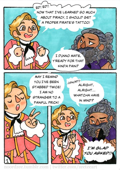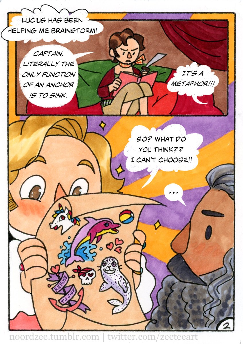 In which Stede is the bravest boy When I first scribbled this comic I just vaguely knew Stede would want unpiratey tattoos, then suddenly a muse descended & bade me google Lisa Frank Sea Animals, thank u O muse #OurFlagMeansDeath #RenewOurFlagMeansDeath #ourflagmeansdeathfanart