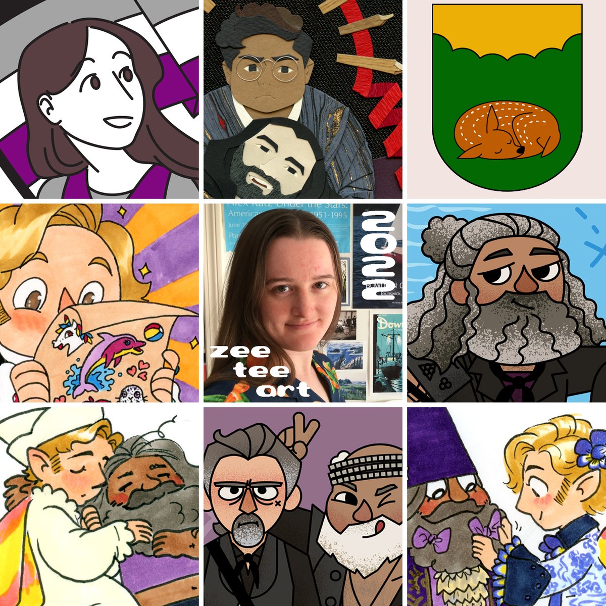 #artvsartist2021 featuring selections from my Book of Days project in the four corners, Aziraphale and Crowley from #GoodOmens at top and bottom, then Mariel of #Redwall to the left and a family I drew for work on the right. And my favorite selfie I took all year!