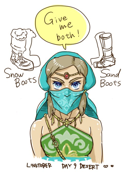 Day9:DESERT ブレワイでお気に入りのミニチャレンジ。「スノーブーツもサンドブーツも両方くれ!」と言ってボテンサさんを困らせる(けど可愛い)女装子リンクさん。 #linktober #linktober2021 #BotW