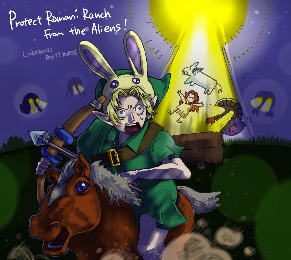 Day11:HORSE 馬といえば、ロマニー牧場のオバケ退治! 個人的に一番難しいサブクエストだと思う。エポナが乗りこなせなくてうさぎ頭巾で走った思い出 (色々と難しかった…一日じゃ描けん…馬は難しいってSHIROBAKOでも言ってたもんね…) #linktober #linktober2021 #ムジュラの仮面 #majorasmask