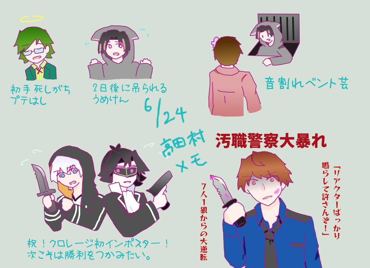 4 39 @tos 6/24高田村、アベ視点中心ここ印象的だったあれこれ。真剣議論あり汚職あり笑いありでとても楽しかったです。 #高田村 #ぷてあーと #うめ絵けん #高田大好きちゅちゅアート #画レージ #黒い夢美術館 #クロレージ #めー画 21/06/25 00:56