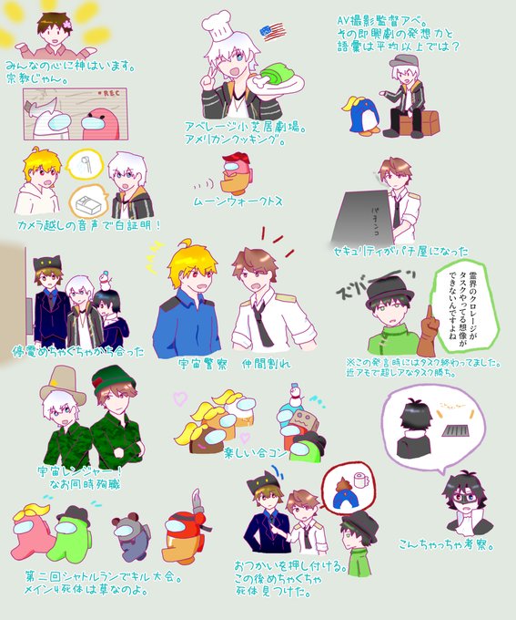 @tos 7/1近アモ、アベ視点中心ここ面白かったなポイントまとめ(タグは登場回数の多い人です)。笑いどころばかりで見る側も消費カロリーが激しかったです。 #面白いこと優船 #画レージ #めー画 #狂人たろあーと #サントスケッチ #あるまぁーと
