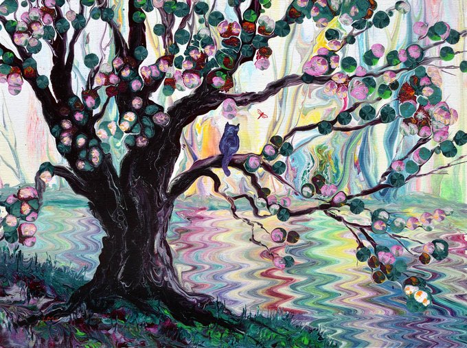 "Cat by a Rainbow River" 12x16 pour painting. Very pleased with this one. The cat made such a difference. Original and prints at zenbreeze.com/products/cat-i… #landscape #artistsontwitter #pourpainting #cat #wallart #wallartforsale #originalart