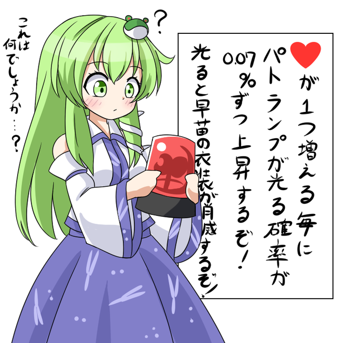 1いいね増える毎にパトランプが光る確率が 0.07%上昇していく パトランプが光ったら早苗さんの衣装が消滅するぞ!