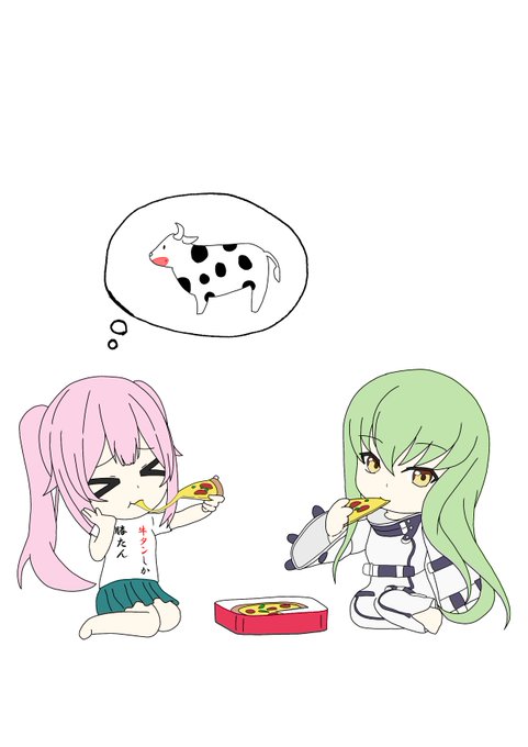 C.C.とC.C.(千代浦蝶美)で描いてみました〜 ちよちゃんはピザを食べながらも頭の中は牛タンでいっぱいです! #千代浦蝶美 #あおぎり高校美術部