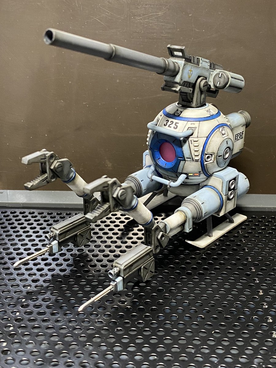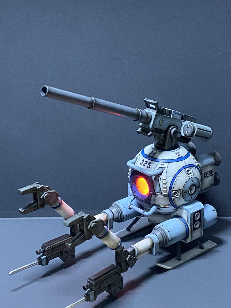 コミックス付録のサンダーボルト版ボール。先月組んだところだが、連載10周年でしたか。初のアクリジョン筆塗りに苦戦したが勉強になった。目を押すと百均LEDが光る。合わせ目消しに疲れ、思いつきで銃剣を付けた。打倒オッゴ #機動戦士ガンダムサンダーボルト #サンボル連載10周年 #ガンプラ #gunpla