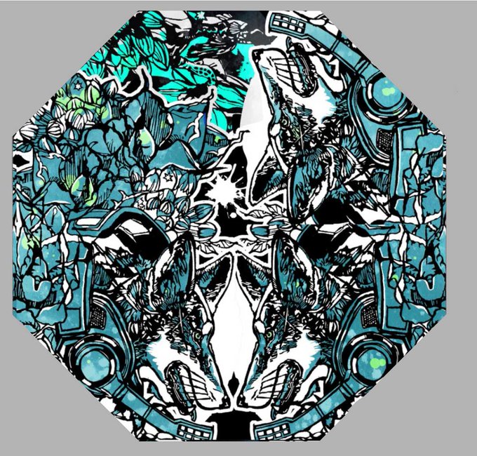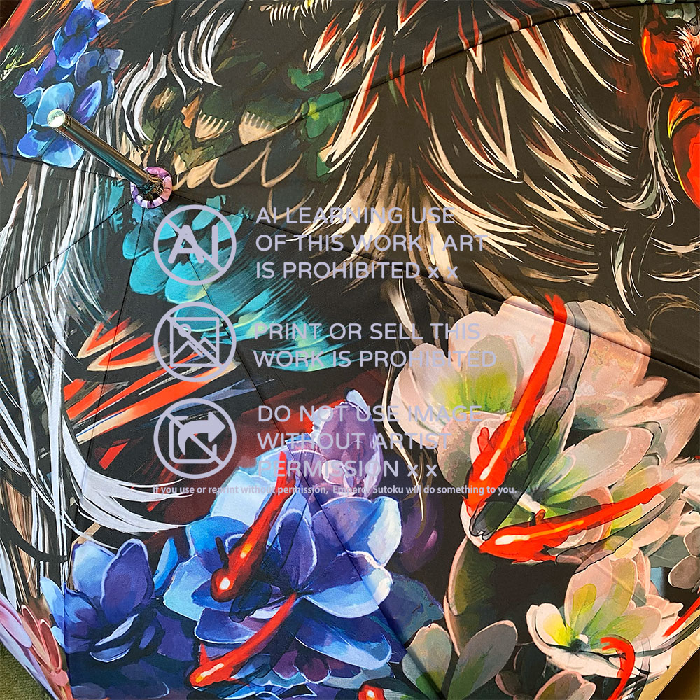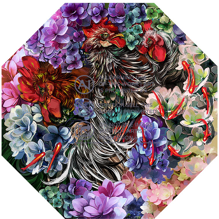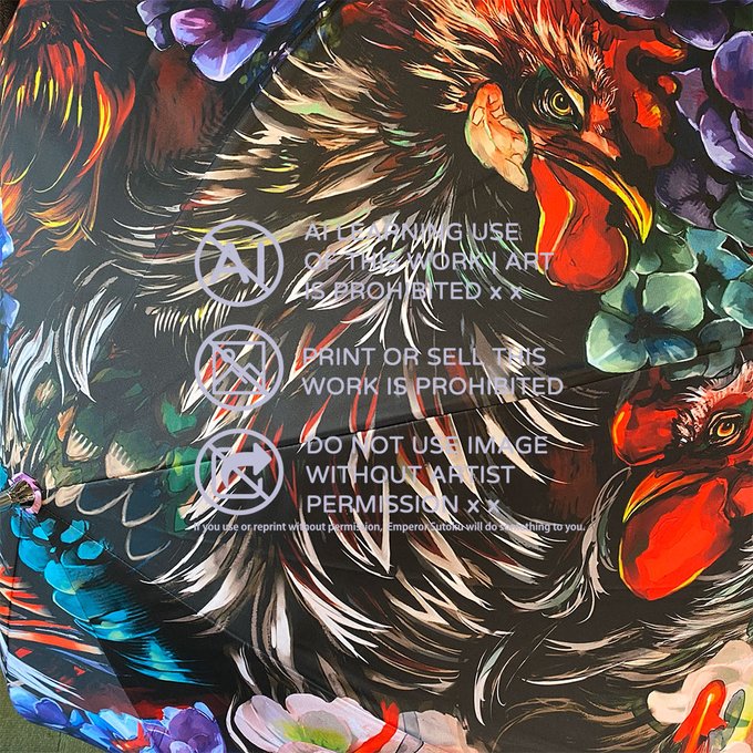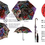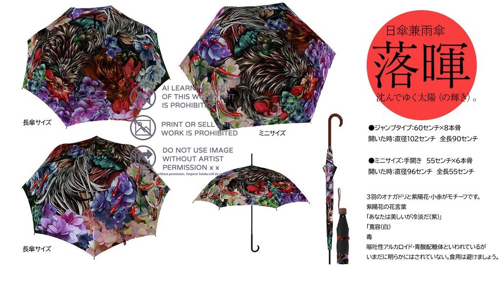 沈みゆく太陽の光をイメージした傘になります。性別関係なく使える厳ついデザイン。三羽の尾長鶏と紫陽花、揺蕩う小金。 紫陽花の花言葉は「あなたは美しいが冷淡だ(紫)」 毒はアルカロイドになります。 #コミティア144 #コミティア144お品書き