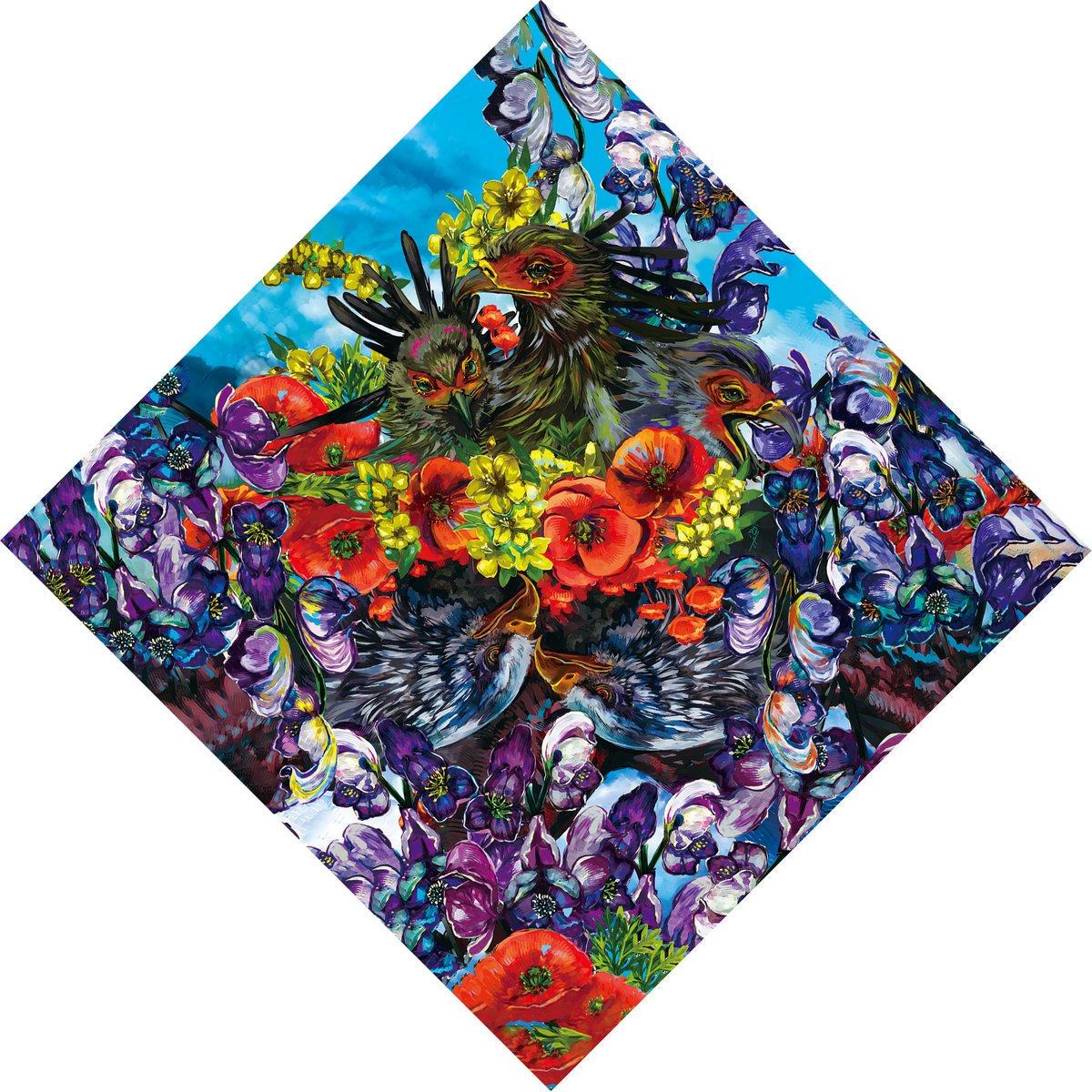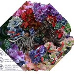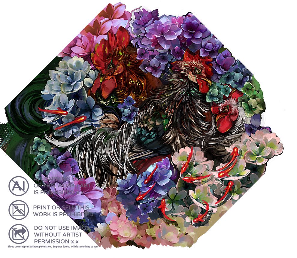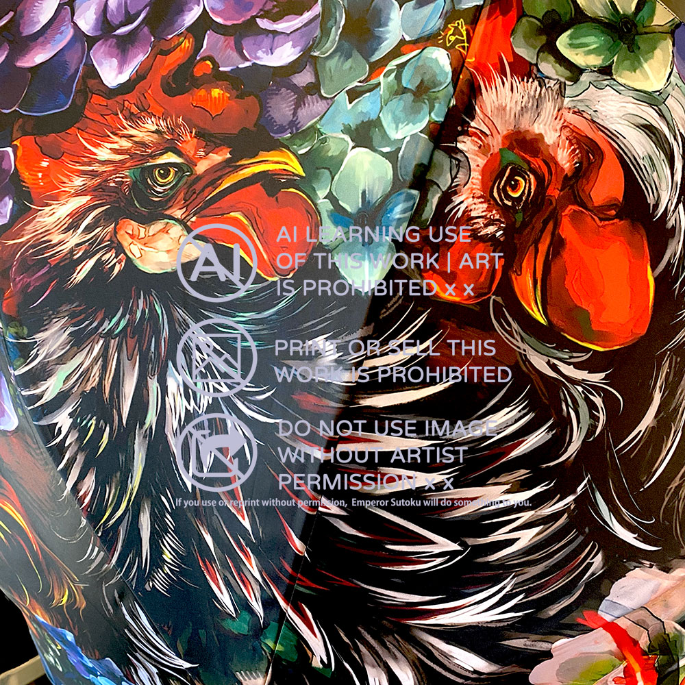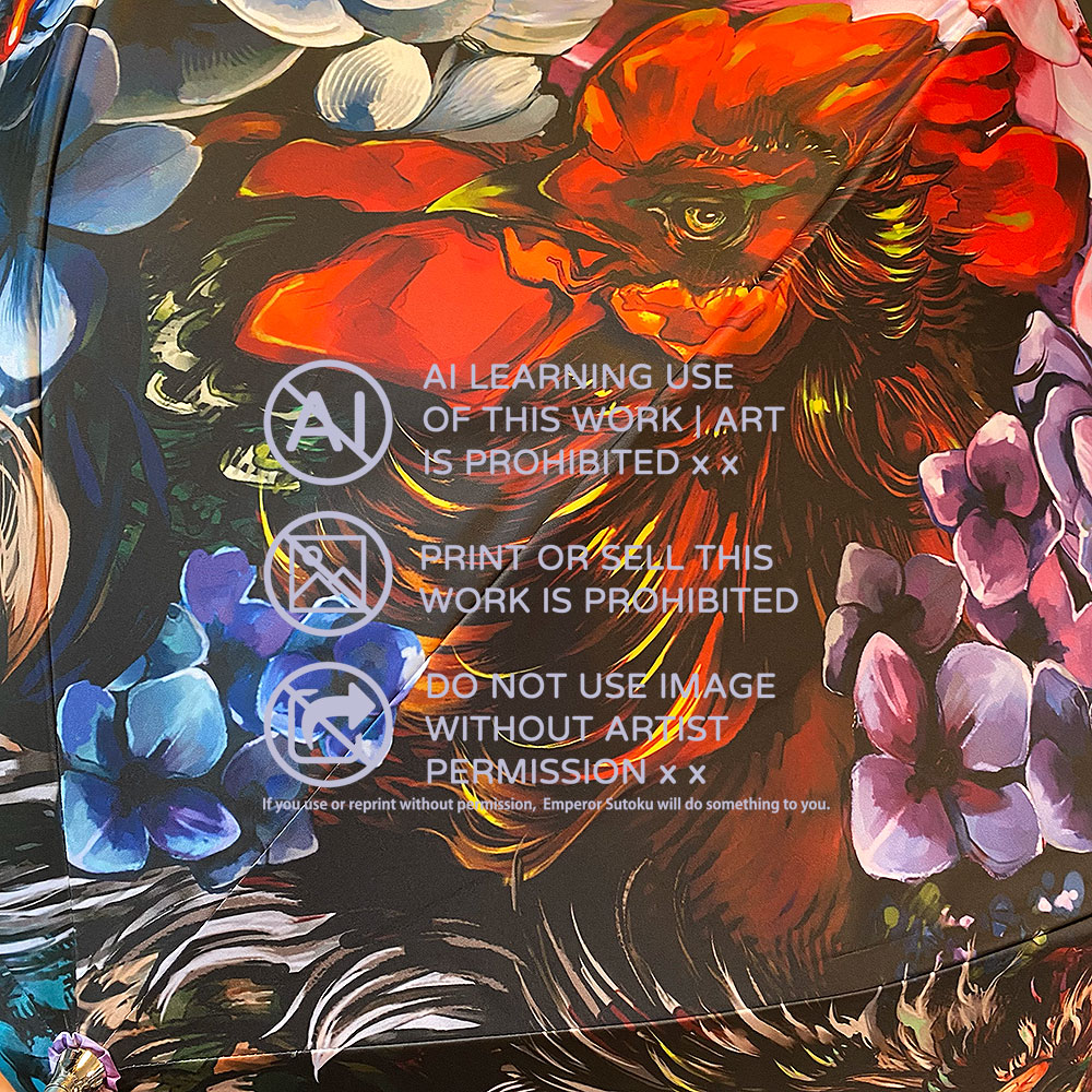 沈みゆく太陽の光をイメージした傘になります。性別関係なく使える厳ついデザイン。三羽の尾長鶏と紫陽花、揺蕩う小金。 紫陽花の花言葉は「あなたは美しいが冷淡だ(紫)」 毒はアルカロイドになります。 #コミティア144 #コミティア144お品書き