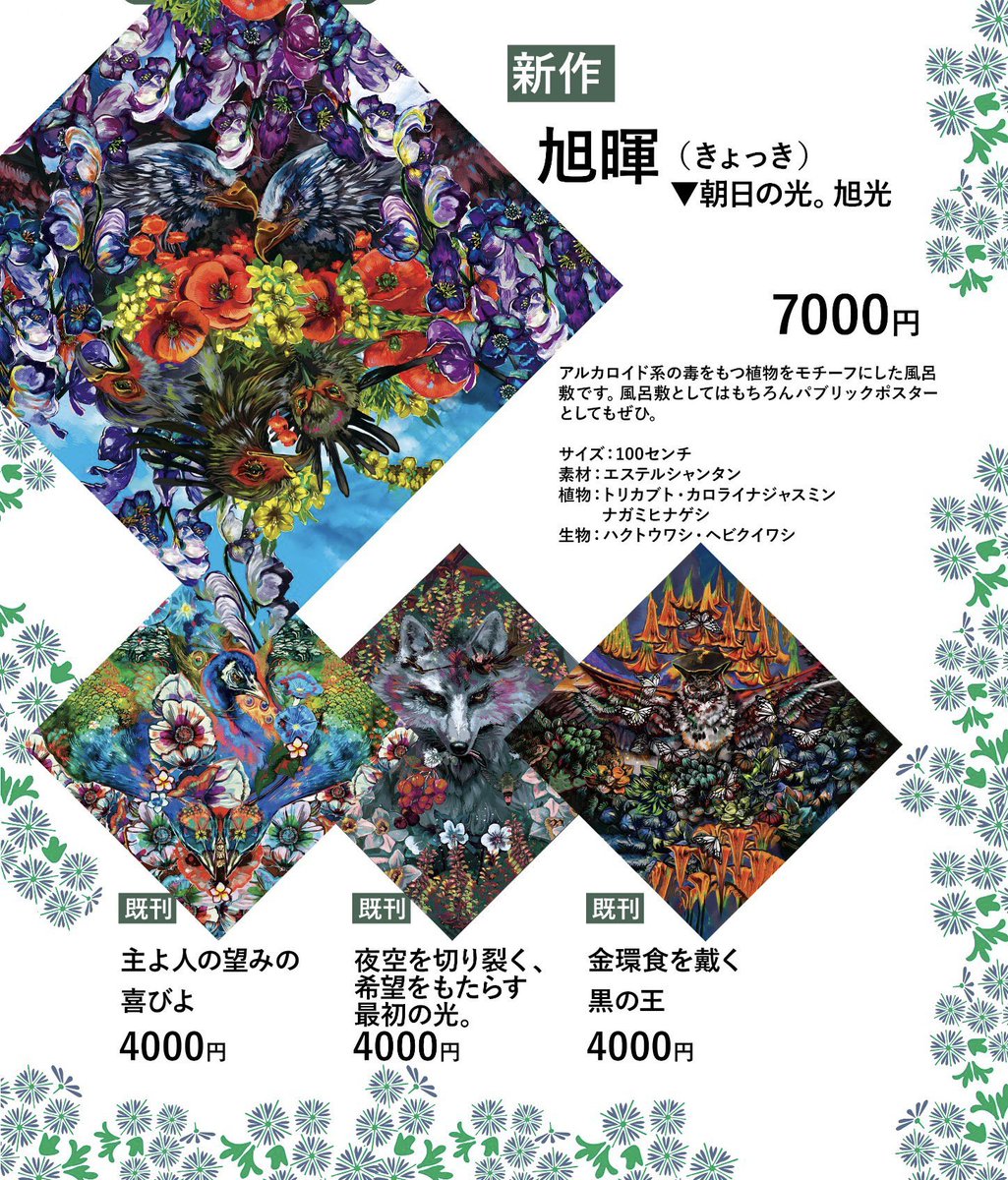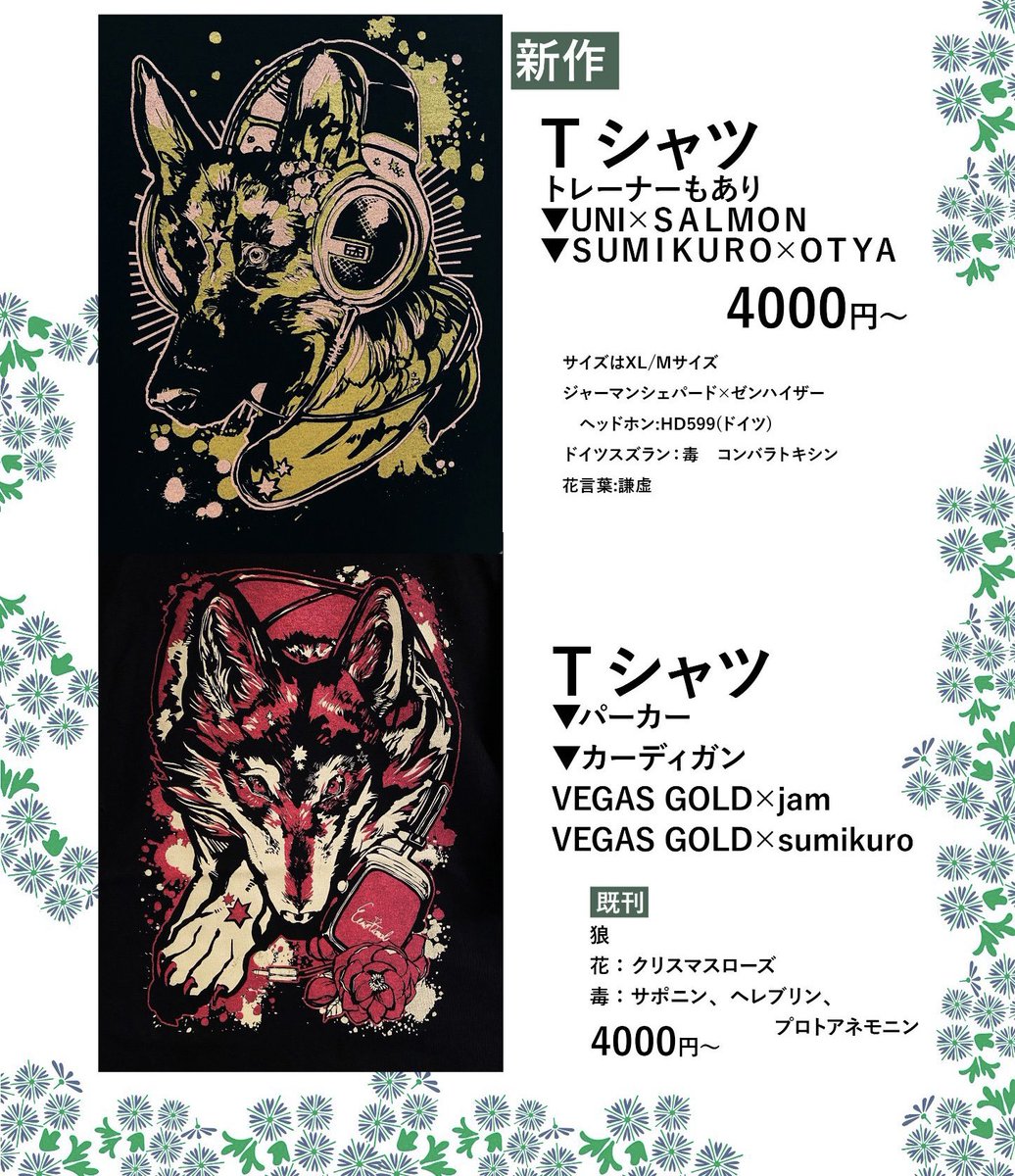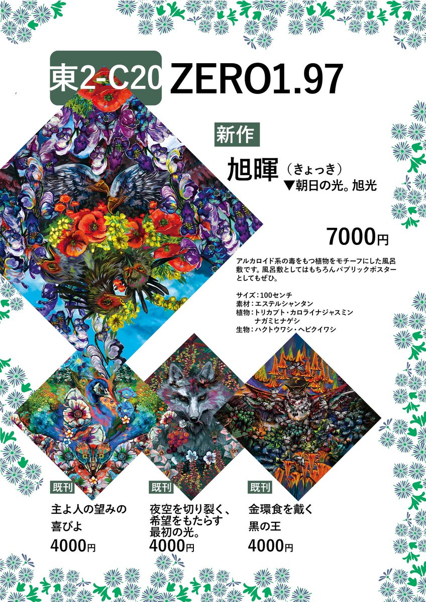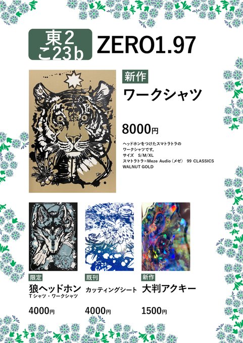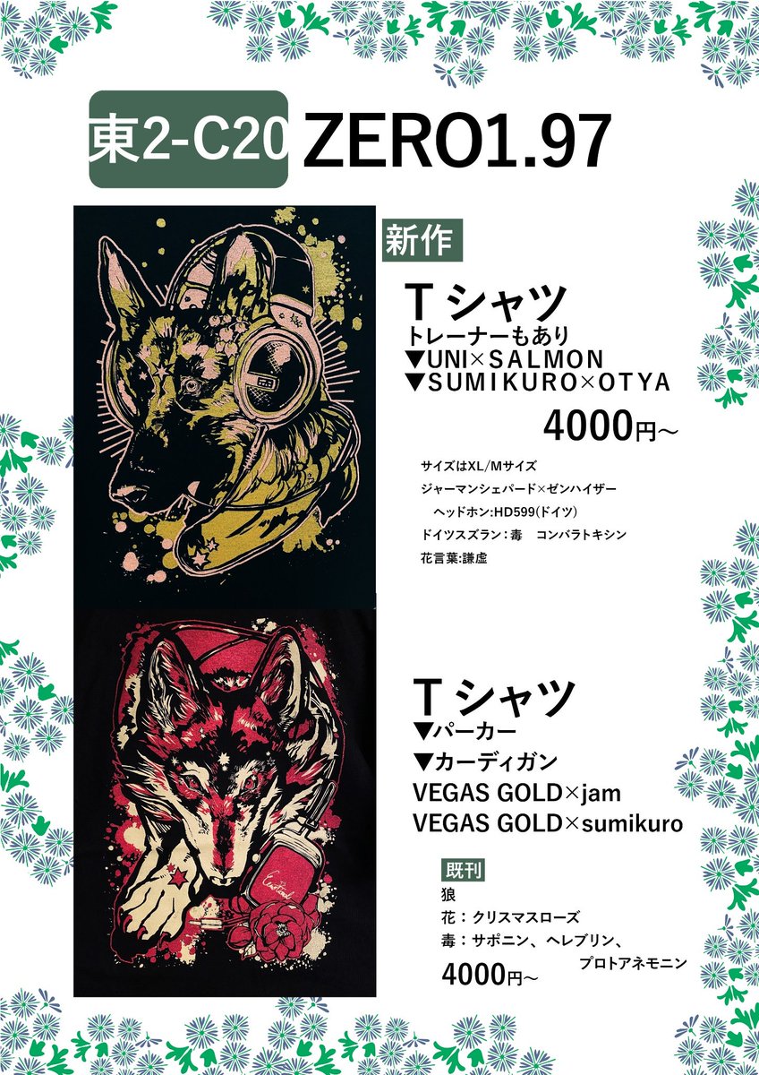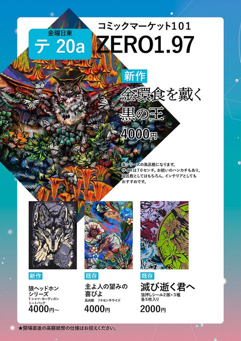 ZERO1.97/金-東テ20a だいたい東6あたり??? 風呂敷と狼アパレル、消しゴム判子や定番のカッティングシート持っていきます。 箔押しギラギラアイテムや圧の強い作品なので是非!! RT宜しくお願いします! #C101 #C101お品書き 1日目 webcatalog-free.circle.ms/Circle/16812065