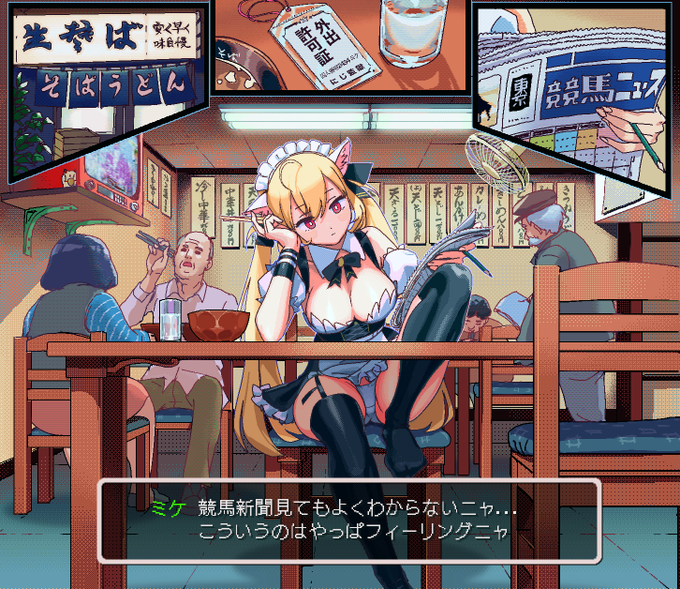 そば屋で競馬新聞を読むはしたないミケ #リオンあーと