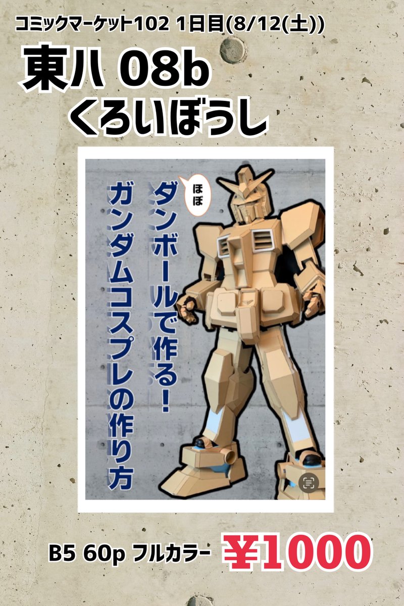 45 82 boothにて新刊『ダンボールで作る!ガンダムコスプレの作り方』の通販を開始しました! booth→ kuroboushi.booth.pm/items/4995178 23/08/11 19:11