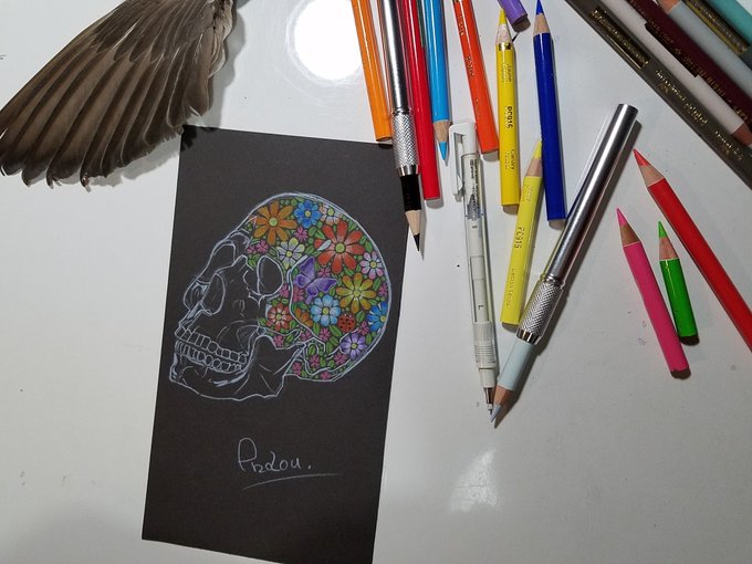 0 15 ちょっと気分転換 #色鉛筆 #色鉛筆画 #お絵描き #スカル #skull #イラスト #花 #flower 20/05/12 21:38