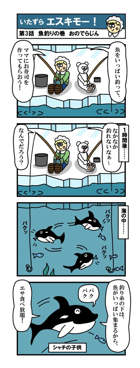世界初!北極形ほのぼの漫画! 「いたずらエスキモー!」 第4話・魚釣その2の巻! 前回、シャチの子供に釣りを邪魔されたエスキモー君達ですが…… #漫画 #漫画家志望さんと繋がりたい #イラスト #イラスト好きな人とつながりたい #4コママンガ #絵描きさんと繋がりたい #漫画が読めるハッシュタグ
