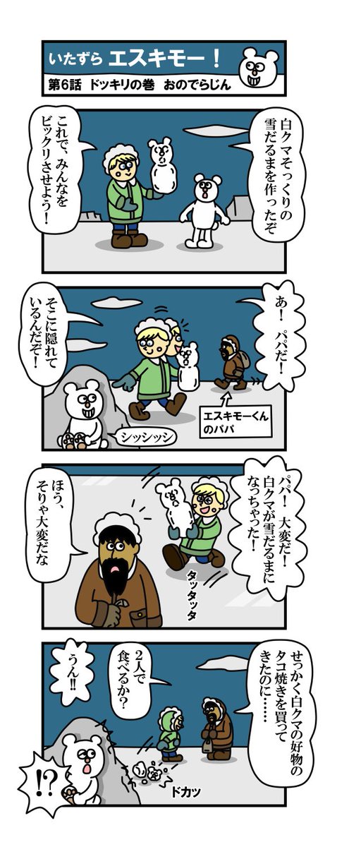 世界初!北極形ほのぼの漫画! 「いたずらエスキモー!」 第6話・ドッキリの巻! エスキモー君、今回はお父さんにドッキリを仕掛けるようです… #漫画 #漫画家志望さんと繋がりたい #イラスト #イラスト好きな人とつながりたい #4コママンガ #絵描きさんと繋がりたい #漫画が読めるハッシュタグ
