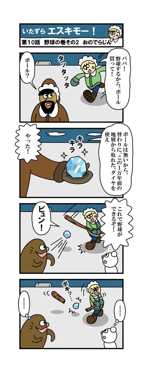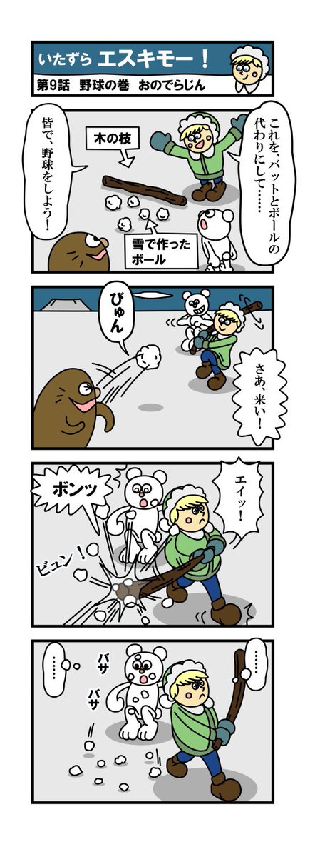 「いたずらエスキモー!」 第9話・野球の巻! エスキモー君達、今日はアザラシ君も入れて、野球で遊ぶようです… #漫画 #漫画家志望さんと繋がりたい #イラスト #イラスト好きな人とつながりたい #4コママンガ #絵描きさんと繋がりたい #漫画が読めるハッシュタグ