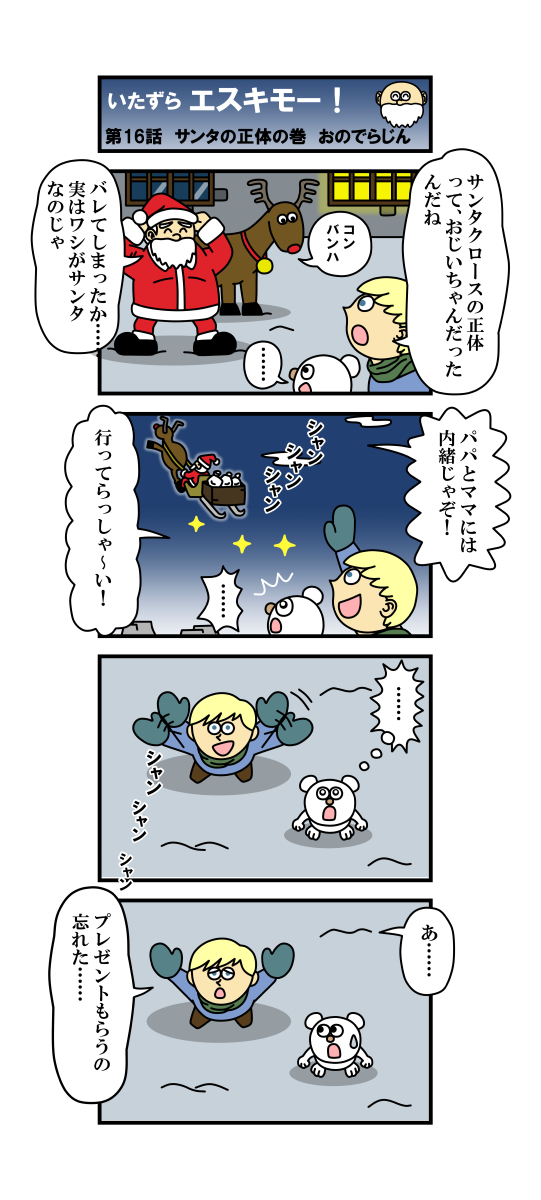 「いたずらエスキモー!」 16話・サンタの正体の巻! 前回、おじいちゃんがサンタの正体だった事を知ったエスキモー君達ですが…… #漫画家志望さんと繋がりたい #イラスト好きな人とつながりたい #4コマ #絵描きさんと繋がりたい #漫画が読めるハッシュタグ