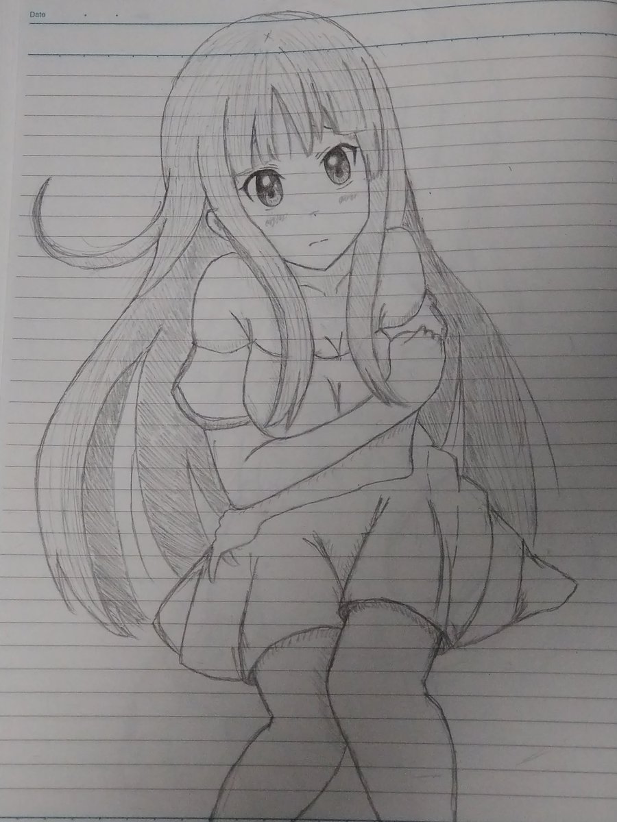 #女子 #イラスト #鉛筆 下から煽って見た感じの絵にしたがったのだが、微妙だなあ 初っ端からオンライン授業は草