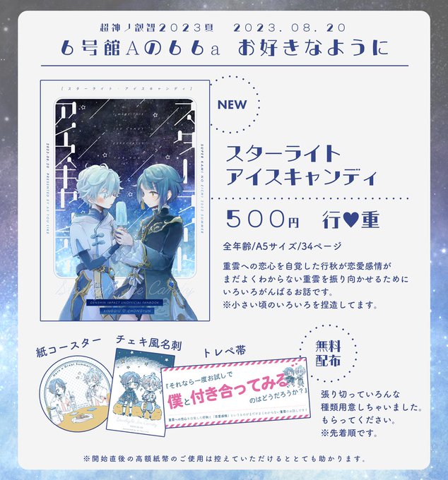 8月20日の超神ノ叡智2023夏のおしながきです〜!スペース【6号館Aの66a お好きなように】です!よろしくお願いします🙇♀️ 通販は開始したらお知らせします 8/20超神ノ叡智2023夏おしながき | ミヤモト #pixiv pixiv.net/artworks/11092… twitter.com/znrdesuyo/stat…