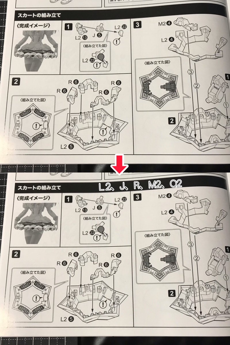 アリスのスカートはL2、J、R、M2、Q2。ランナー何回も探すのめちゃくちゃ大変。せめて部位ごとどのランナー使うか載せて欲しい(−_−;) #メガミデバイス