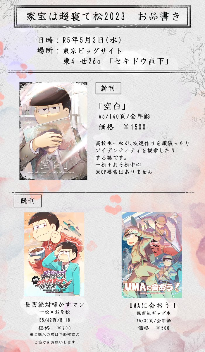 34 93 5/3家宝は超寝て松2023のおしながきです 東4ホール せ26a セキドウ直下 にてお待ちしてます よろしくお願いします 23/04/30 22:18