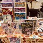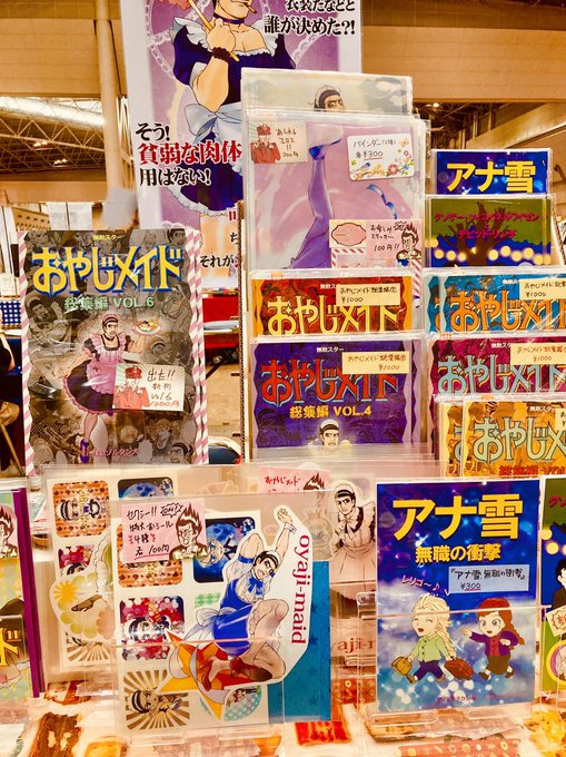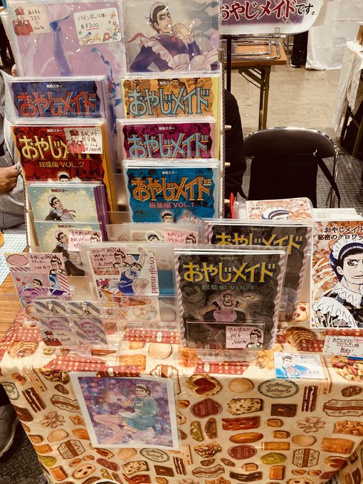 コミティア設営完了しました。無敵スター「おやじメイド」新刊、キュートなシール、えっちなバインダーなどあります!あと家人の文フリ新刊チラシ「クソゲー・ツィゴイネルワイゼン」チラシも無料頒布!立ち読みしてって下さい。 #コミティア140 #COMITIA140