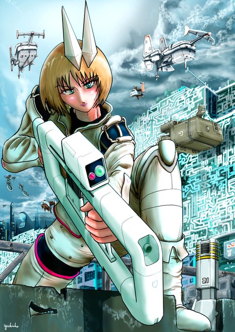 1 12 オリキャラのカガラ情報士官の絵を描きました。屋上で遠心ライフルを構えています。背景にはシュモー級汎用船2隻、スパクス級貨物船1隻、ドローン人間2体、ソイン級通報船2隻を描いています。 #イラスト #絵 #illustration #架空兵器 22/10/11 08:13
