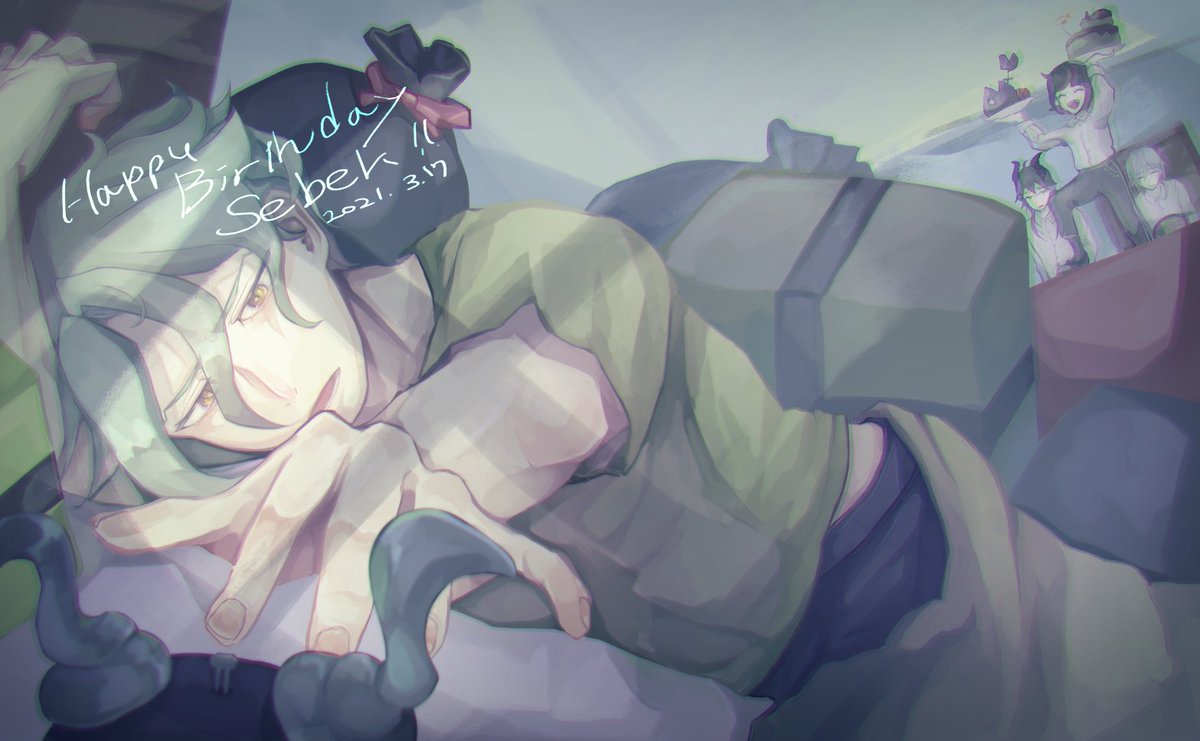 #アズール・アーシェングロット誕生祭2021 #アズール・アーシェングロット生誕祭2021 #ツイステファンアート 誕生日おめでとうございます! フロイド先輩が美味しい唐揚げいっぱい作って、アズール先輩はチートデイでいっぱい食べてみんなハッピー