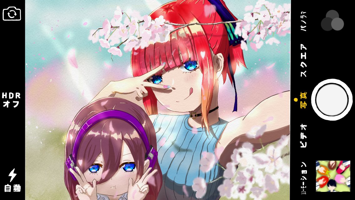 8 6 #五等分の花嫁 #二乃 #三玖 #イラスト #桜 #色違い #いつのカメラ? #フォルダーの方は6人 お互いの色を身に着けて、ハイ、チーズ! 22/01/21 02:34