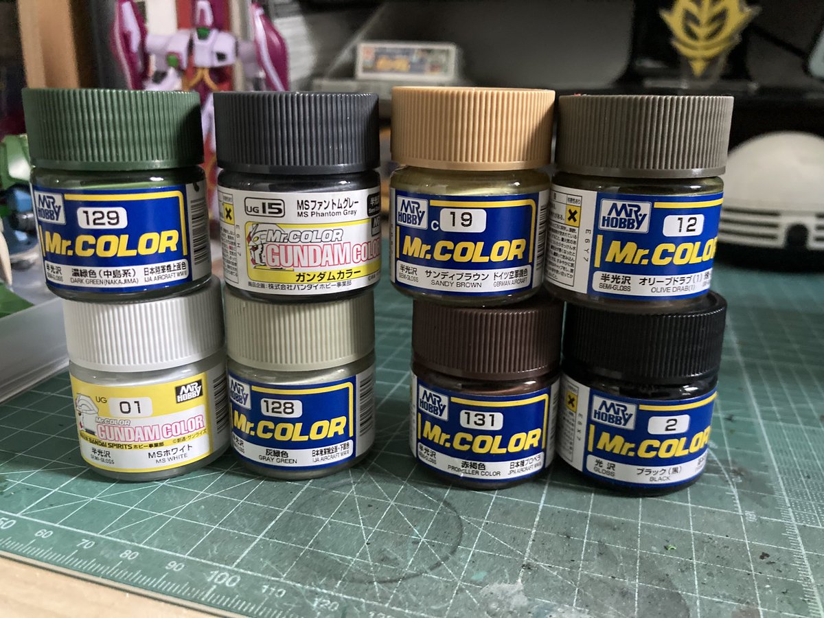暑すぎる!! ザクキャノンをサフ吹いて〜 なんかこの辺をまぜたりして色塗りましたー^ ^ こちらもジオン残党軍カラーで! #ジオン残党軍 #ザクキャノン #ユニコーンガンダム #ガンプラの画像貼るとRTされると聞いて #ガンプラ好きと繋がりたい
