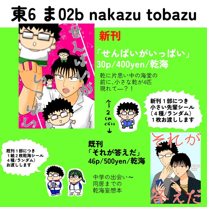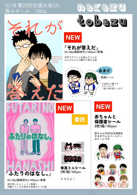 20 38 12/18 全国大会 お品書き | zoo #pixiv pixiv.net/artworks/10365… お品書きと当日のポスターです!新刊にはポスターにある乾海シール4種のどれか1種をお渡しします✌️(いらなかったら言ってください👋) 22/12/16 22:32