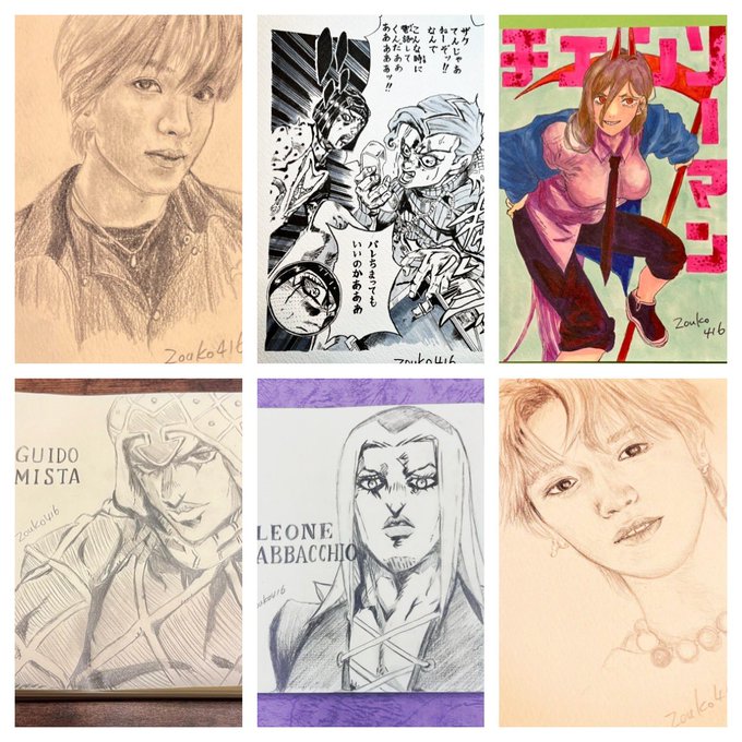 #今月描いた絵を晒そう 今月は6枚描きました。 Instagramの方のみであげていたイラストを含めて6枚。上段左からnctのヘチャン、ドッピオとブチャラティ、チェンソーマンのパワー、下段左からミスタ、アバッキオ、nctのテヨン(love theory のMV時のテヨン) ヤバい。今月はカラー1枚しか描いてない😱