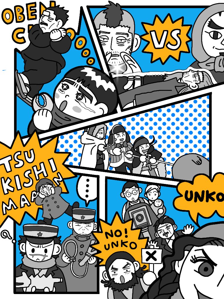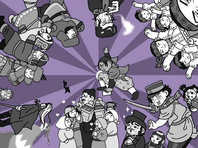 #ゴールデンカムイ版深夜の真剣お絵描き60分一本勝負 【お題】青紫、紫 (16巻カバーイラストのカラーイメージ) 遅刻常習犯です申し訳ありません🙇💦 16巻の出来事をつめつめしてたら、丁度🎏少尉が中心になりました😂 ある意味彼に持っていかれた巻でしたよね😂