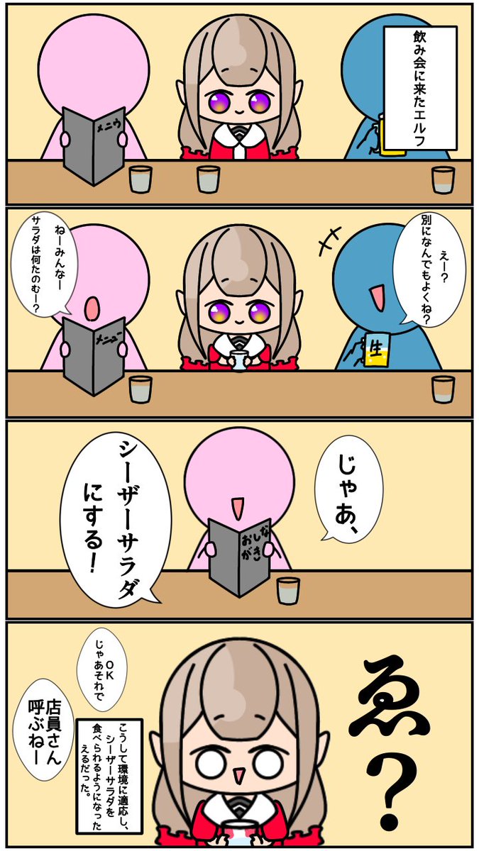 3 18 えるえるがシーザーサラダ食べれるように なったときの4コマ漫画! 初めて漫画描いたんで、下手でも 許してください…🙇♀️🙇🙇♂️ #えるの絵だよ 22/05/08 22:41