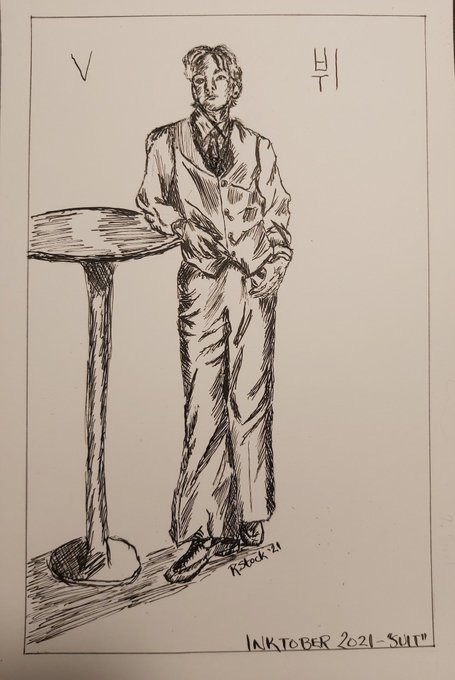 So I'm a few days behind already, but I figured out my ink problem so it should be easier going now! For #inktober2021 Day 2 was "suit." When I think about suits in connection with #BTS, my mind immediately goes to V, and in particular Dynamite Era V! So I chose to draw one of+