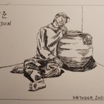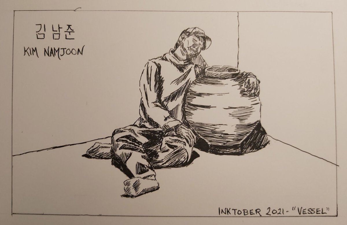 The third prompt for #inktober2021 was "vessel." For this one, I found a really cute pic of Namjoon sitting beside a beautiful jar. I just loved the smile on his face in the pic, and since a jar is a vessel, it worked for the prompt. #art #artistsontwitter #bts #btsrm #kimnamjoon