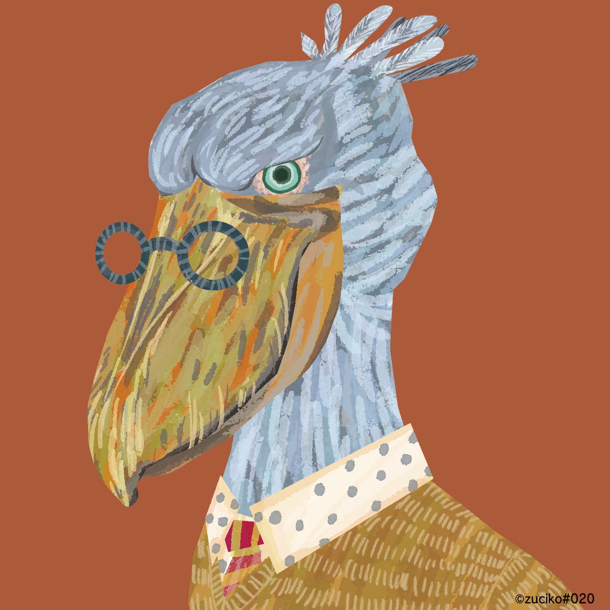 zuciko's art #020 皆様おはようございます!体も心も調子が上がってくる火曜日★ 本日は「つぶらな瞳で遠くを見つめる初老のハシビロコウ」です♪ 今日も一日頑張っていきましょう( ⁎ᵕᴗᵕ⁎ )❤︎ #ハシビロコウ #イラスト好きさんと繋がりたい #鳥好きさんと繋がりたい #art #Shoebill