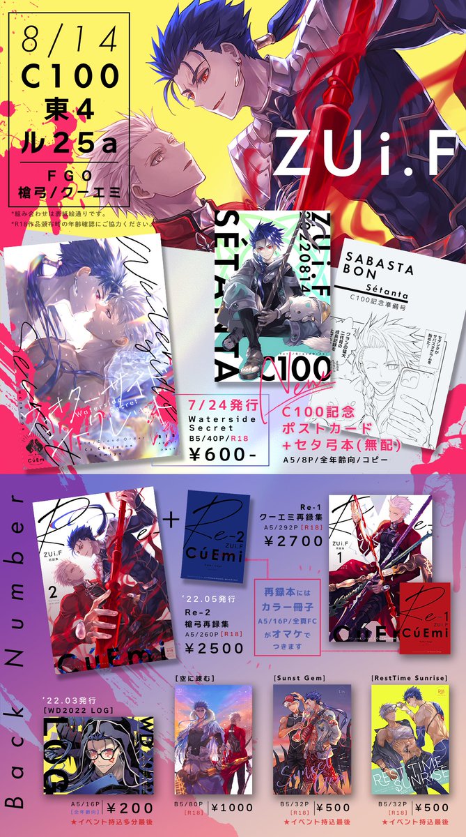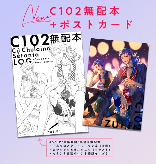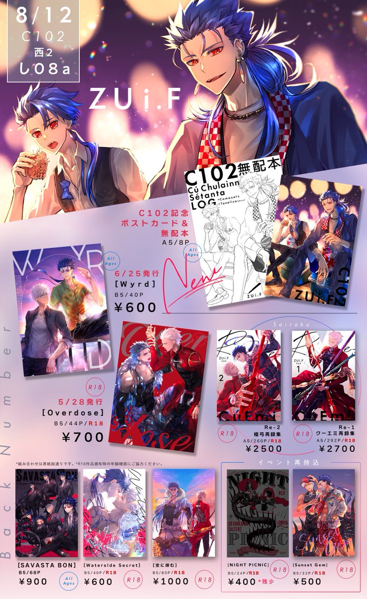8/12 C102(夏コミ1日目)|西2 し08a「ZUi.F」お品書き コミケwebカタログ:webcatalog.circle.ms/Perma/Circle/1… [当日NEW]C102記念ポストカード&無配本 他: 夏至槍弓本、キャス弓媚薬本、クーエミSNS本、槍術弓、ガンバト槍弓、狂王弓2種、再録集2種 #C102 pixiv→pixiv.net/artworks/11065… twitter.com/zuif_d/status/…