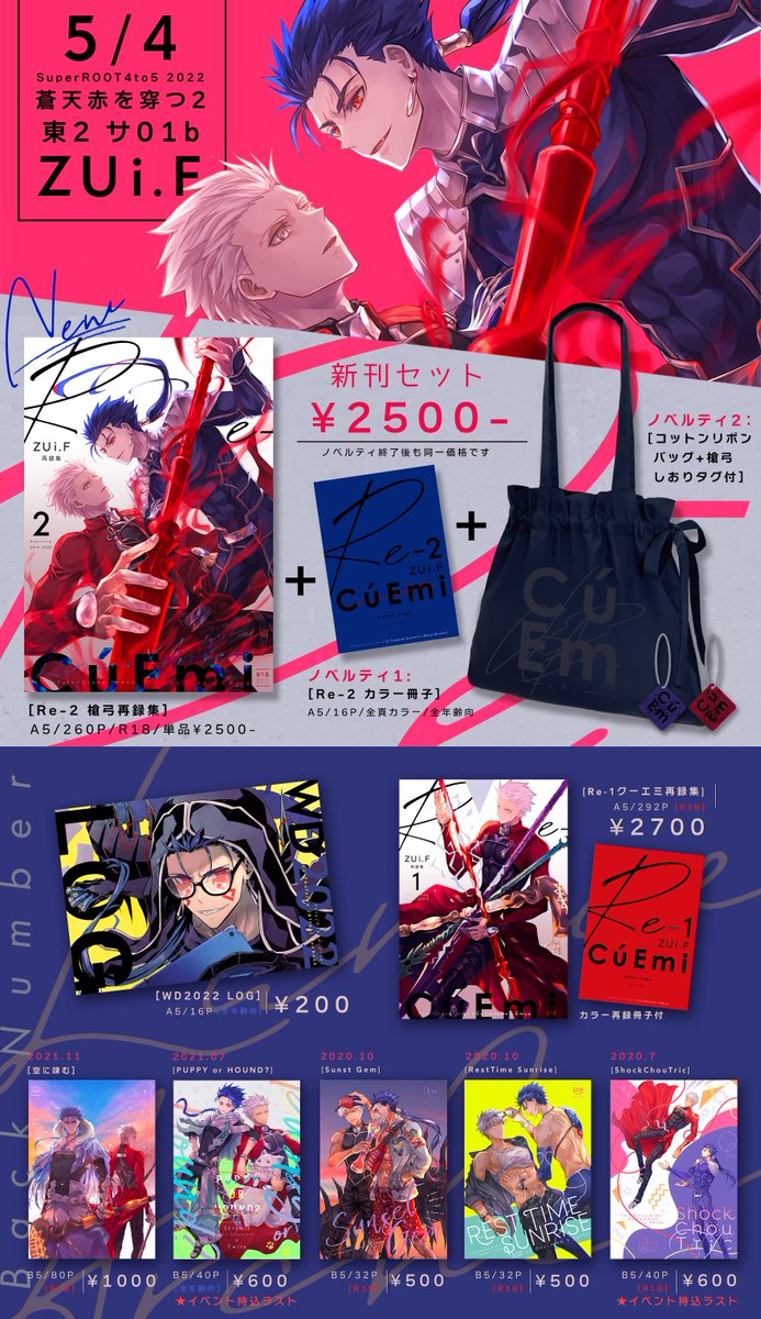 【5/4蒼天赤を穿つ2|東2サ01b「ZUi.F」お品書き】 新刊は槍弓の再録本でノベルティ2種付きセットあり、他クーエミ再録Re-1、春コミのWD狂王らくがき感想本、槍術弓とセタ弓と狂王弓があります。 セタ弓と槍弓触手本はイベ頒布ラスト予定です。 pixiv.net/artworks/97923… セットについてなどスレッド→