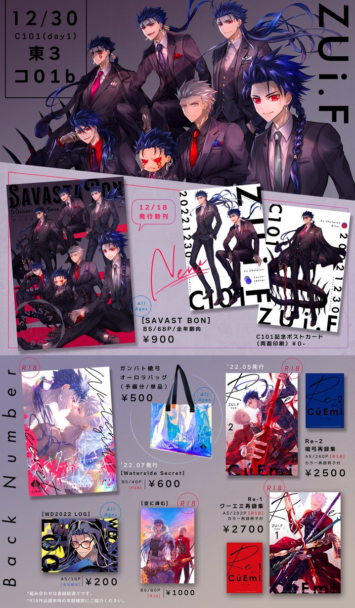 12/30 #C101 冬コミ1日目|東3コ01b「ZUi.F」お品書き(FGO槍弓・クーエミ/女性向BL) 12/18発行新刊のほかC101記念クー・フーリンポスカ無配があります! ほか槍弓、再録2種、五次槍→術の槍術弓、WDオルタニキ感想本 コミケwebカタログ→webcatalog.circle.ms/Perma/Circle/1… pixiv→pixiv.net/artworks/10396…