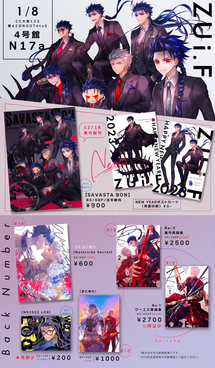 1/8 インテ大阪123/第42次ROOT4to5|4号館N17a「ZUi.F」お品書きです! 12/18発行新刊クーエミSNS本のほか、当日用のニューイヤーポストカードがあります! ほか:クーエミ再録集(持込少)、槍弓再録集、槍術弓、ガンバト槍弓、WDオルタニキ感想本(残少) pixiv→pixiv.net/artworks/10423… twitter.com/zuif_d/status/…