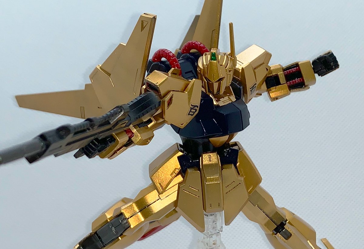 HGUC 百式のメタリックゴールド塗装ver.完成いたしました‼️ 金色の輝きを再現したくガイアさんのスターブライトゴールドで塗装し、仕上げに光沢トップコート吹きかけました( • ̀ω•́ ) 良かったらご感想お願いします! #ガンプラ #百式 #ガンプラの画像貼るとRTされると聞いて